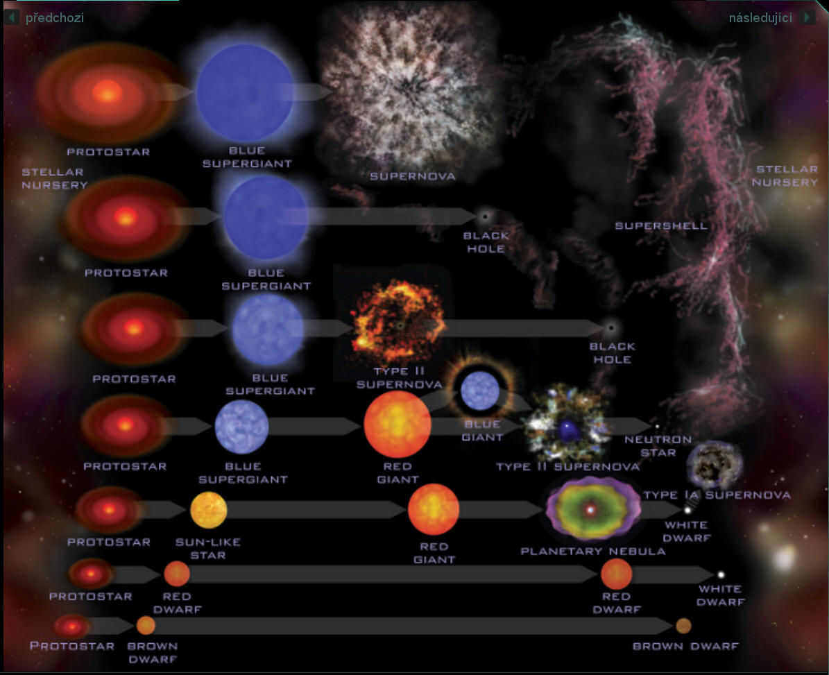 I když se nám to za náš krátký lidský život může zdát, hvězdy nejsou neměnné žhnoucí koule. Od svého zrodu se vyvíjí v několik různých druhů od trpaslíků až po veleobry, mají různé barvy a také zanikají několika možnými způsoby od klidného rozplynutí až po ty největší exploze ve vesmíru. Znalosti lidstva o životě hvězd se v posledních letech rozrostly jednak díky stále podrobnějšímu studiu naší vlastní hvězdy a jednak díky pozorování vzdálených hvězd stále silnějšími a přesnějšími teleskopy. Jak bude hvězda žít a jak zanikne se rozhoduje už při vzniku protohvězdy. Ta vzniká kolapsem obrovského oblaku plynů a prachu (Giant Molecular Cloud, GMC), který se vlastní gravitací smršťuje do středu, kde postupně roste tlak i teplota a vzniká rotující koule žhavých plynů, nazývaná protohvězda. Následný vývoj (hlavní posloupnost hvězdy) už závisí na množství hmoty, ze kterého protohvězda vzniká ...