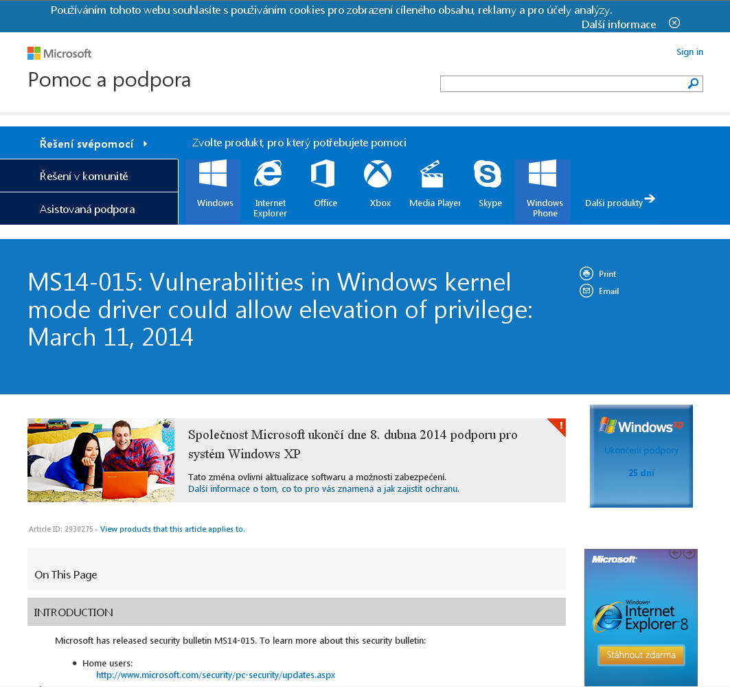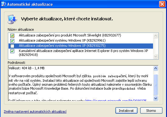 V opačném případě budete ve Windows XP buzerováni, že prý máte nepodporovaný systém - sice se zdá, že by to mělo jít vypnout, ale co se dá vypnout, dá se i zapnout. Po kliknutí na aktualizace (jestli máte automatické, hazardujete s bezpečností - nevěřte ani MS!) vyberte aktualizovat ručně (2. volba), u aktualizace zabezpečení systému XP (KB2930275) zrušte zatržítko a dejte instalovat. Objeví se další okno s otázkou: Na tyto aktualizace již neupozorňovat? - tady naopak zatržítko zaškrtnete - a budete mít klid ...