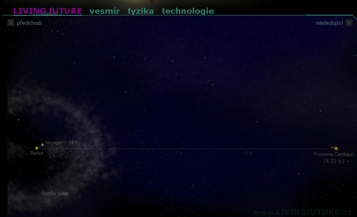 Slunce a Proxima Centauri - K nejbližší hvězdě je to 4,22 světelných let, nejvzdálenější lidská sonda je od Země vzdálená asi 16 světelných hodin.
