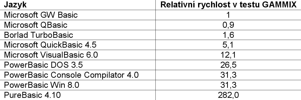 Rychlost programů napsaných v PureBasic řádově překračuje rychlost dosahovanou staršími typy jazyku BASIC (Tab. 1). Spolu s vyšším výkonem soudobých počítačů to vede k nutnosti provádět původní GAMMIX test v mnohonásobné opakovací smyčce. Na počítači typu Pentium 4 (3 GHz, Win XP Pro) trvá stonásobné provedení testu pouze 31 ms. Aplikace napsané v PureBasic nemusejí být instalovány. Pokud kromě exe souboru obsahují soubor helpu a pomocné datové soubory, zpravidla postačí umístit všechny soubory v jednom adresáři. S ohledem na uživatelské zvyky je samozřejmě možné šířit jakoukoliv PureBasic aplikaci ve formě instalačního balíčku a vyžadovat k instalaci administrátorská práva. Exe soubory aplikací vytvořených v PureBasic jsou mimořádně malé a portable aplikace jsou proto přenosné opravdu snadno.