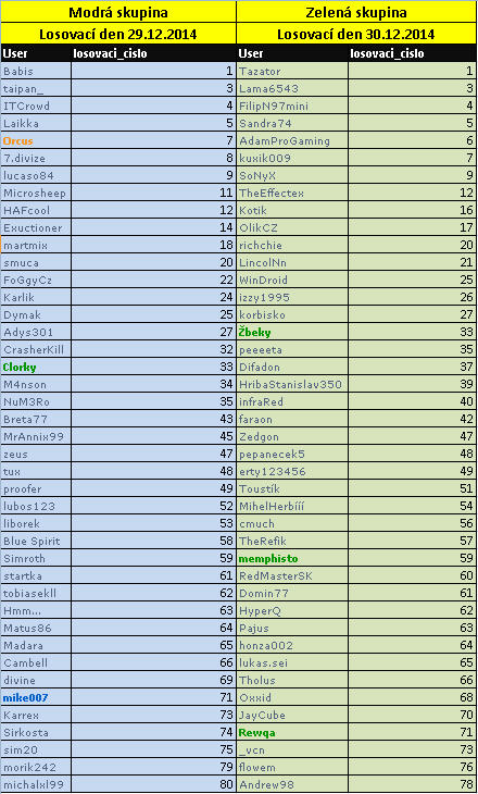 Dne 29.12.2014 bude soutěžit skupina modrá, dne 30.12.2014 bude soutěžit skupina zelená a takto pořád dál, dokud z každé skupiny nevzejde 1 finalista. 2 finalisté se nakonec utkají (každý se 40 losovacími čísly) ve finálovém kole, jehož datum bude dopředu upřesněn.