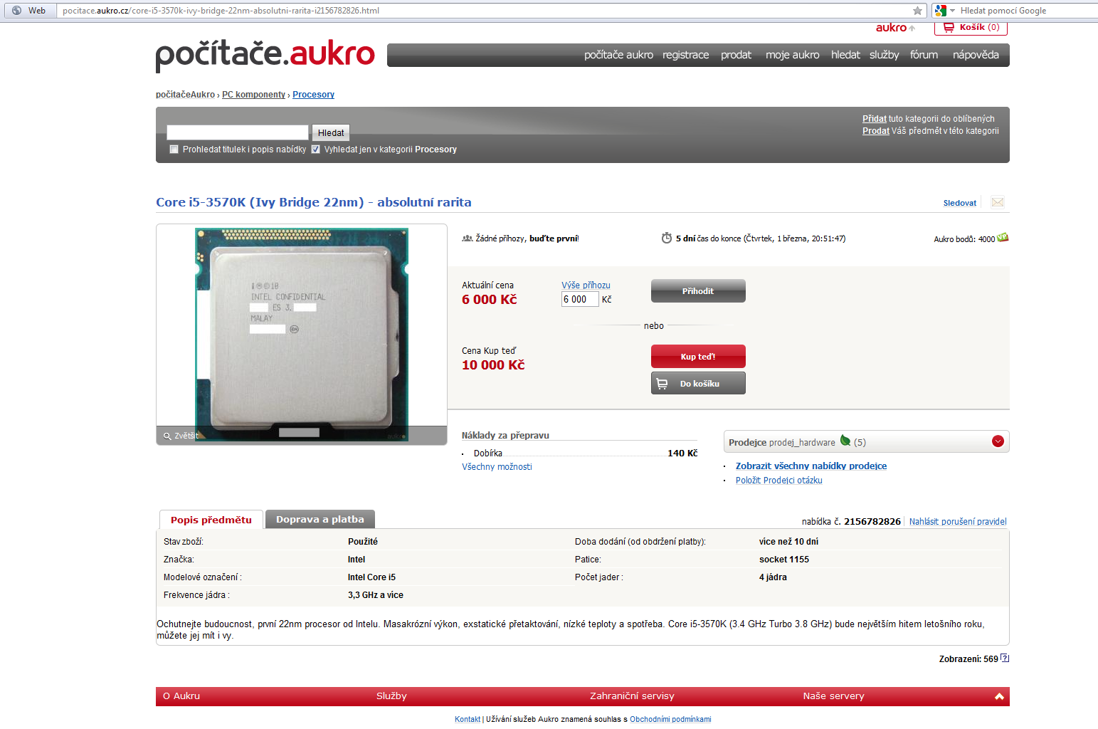 Tak jsem dneska brouzdal po Aukru co tam nabízí a ono na mne vypadne toto Core i5-3570K (Ivy Bridge 22nm) - absolutní rarita