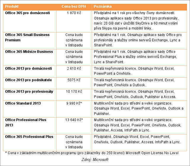 Česká pobočka společnosti Microsoft již zveřejnila doporučené ceny Office 2013 a výši předplatného Office 365. Sada Office 2013 pro domácnosti s aplikacemi Word, Excel, PowerPoint a OneNote vyjde na 2610 Kč. Sada Office 2013 pro podnikatele, která navíc nabídne program Outlook, bude stát 5075 Kč. Za Office 2013 pro profesionály si zájemci zaplatí 10 170 Kč a k programům Word, Excel, PowerPoint, OneNote a Outlook získají ještě navíc Publisher a Access.
