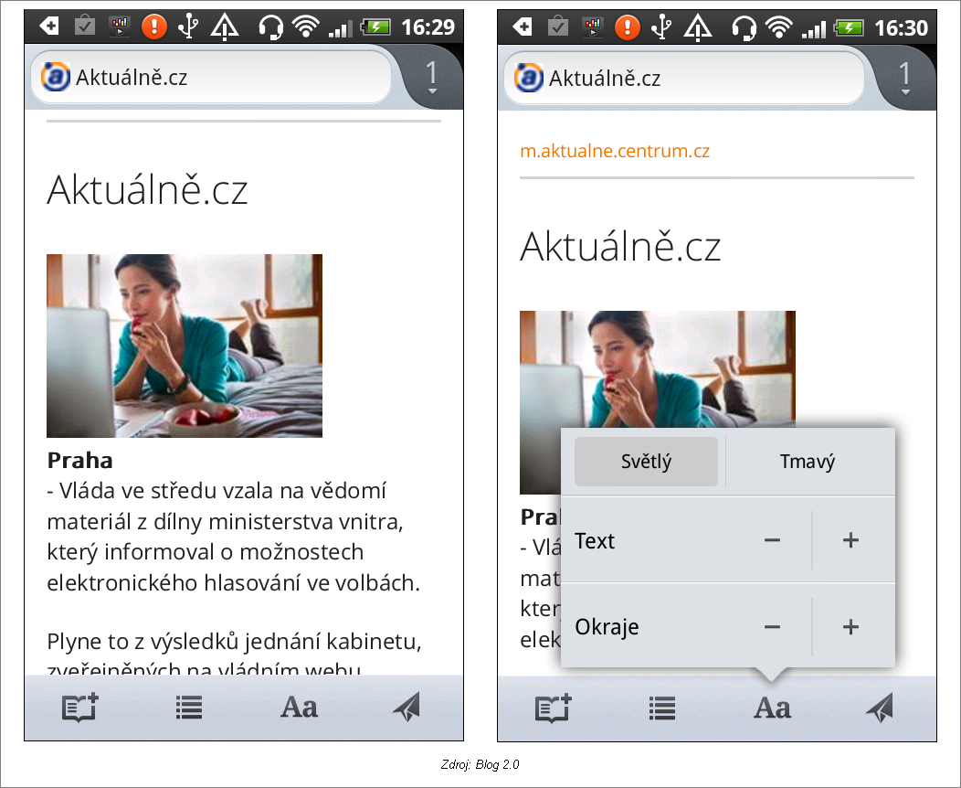 V režimu pro čtení je možné snadno přidat článek do seznamu textů k pozdějšímu přečtení, ale hlavně lze jednoduše přepínat mezi dvěma vysoce kontrastními režimy zobrazení a neméně jednoduše zvětšovat či zmenšovat text nebo nastavovat okraje zobrazeného článku tak, aby například nebyl jeho text namačkán až k okraji displeje zařízení, což je při čtení poměrně nepříjemné.