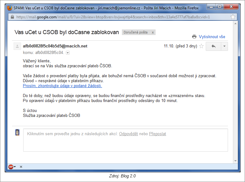 Do českých e-mailových schránek doputoval nový podvodný e-mail, který je cílen na klienty tuzemského peněžního ústavu. Tentokrát jím není Česká spořitelna, ale ČSOB. E-mail napsaný v bezchybné češtině (pomineme-li chybějící diakritiku a špatně použitá velká písmena v předmětu zprávy) tvrdí, že žádost o provedení platby byla přijata, ale bohužel nemá ČSOB v současné době možnost ji zpracovat.