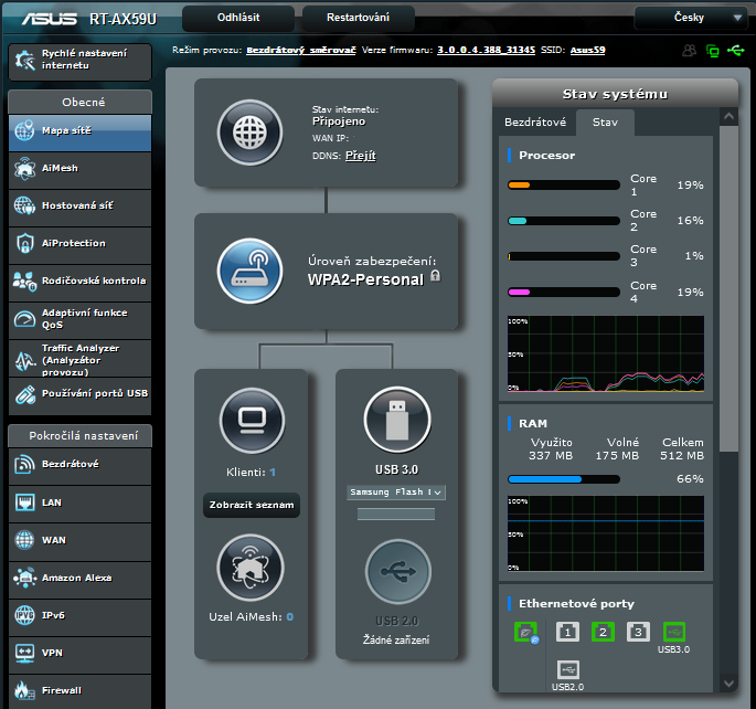 Zde najdete souhrn všech informací - připojené klienty, obsazení LAN a USB portů, informace o WiFi a také vytížení procesoru a obsazenost paměti.