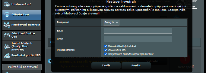 AiProtection - Routery Asus spolupracují s TrendMicro. Na základě informací z jejich databáze dokáží zablokovat škodlivé stránky, nebo identifikovat napadené zařízení ve vaší síti. Také hned uvidíte potenciální hrozby: