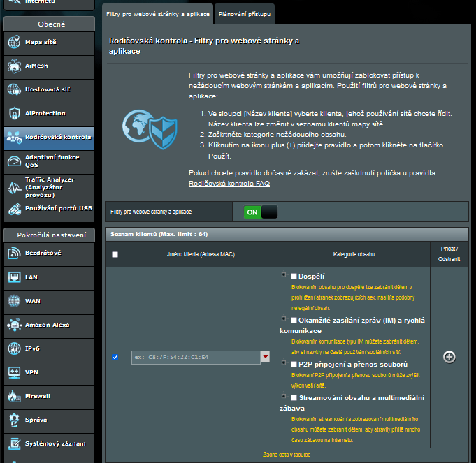 Rodičovská kontrola - zde můžete nastavit omezení pro vaše ratolesti. A to nejen pro stránky s obsahem pro dospělé, ale i omezení komunikátorů, P2P připojení a multimedia. Nastavení je vázáno na MAC adresu (fyzická adresa síťové karty), kterou není tak jednoduché změnit, případně u některých zařízení změnit vůbec nejde.