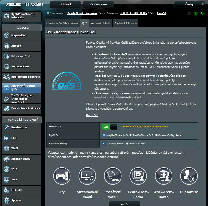 QoS - služba, jež zajišťuje přednostní doručování paketů. Oproti minulým zde přibyly možnosti "učení z domu" a "práce z domu" - pravděpodobně díky covidu. Pro ty, kdo chtějí omezit rychlost (šířku pásma), toto nastavení nejdete rovněž zde.