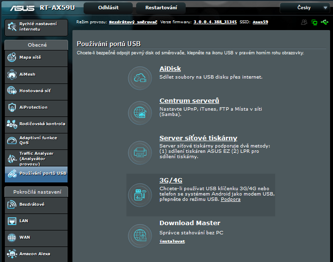 - Centrum serverů - sdílení souborů v interní síti (SAMBA), upload/download souborů přes FTP protokol, DLNA - využijete pro přehrávání multimediálních souborů na vaší chytré TV, Server síťové tiskárny - připojíte tiskárnu pomocí USB do sítě a získáte tak síťovou tiskárnu, 3G/4G klíčenka - umožní náhradní přístup k internetu v případě, že hlavní připojení vypadne, Dovnload master - pokud stahujete soubory z internetu, nemusí zbytečně běžet počítač.