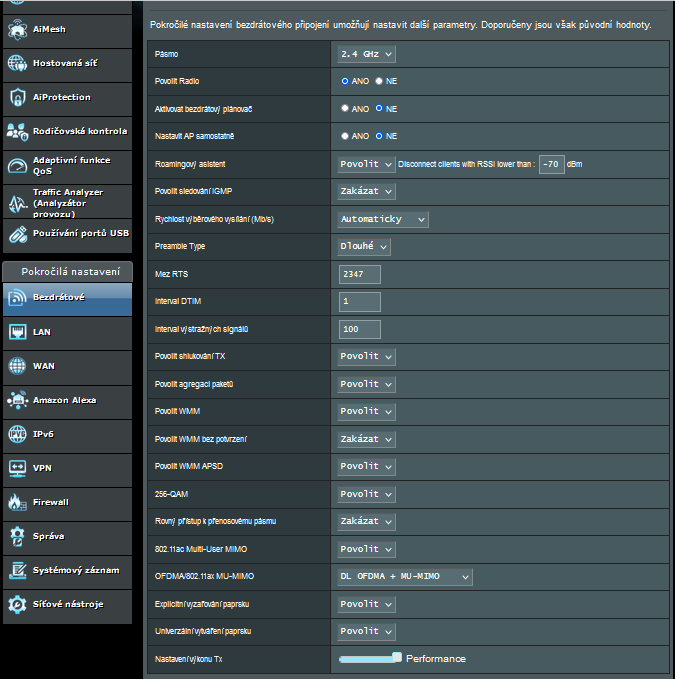 Nastavení WiFi - je u routeru srovnatelné s možnostmi WRT firmwarů. Včetně možnosti nastavení síly signálu, kterou hodně uživatelů požaduje, avšak neznám nikoho, kdo by ji neměl nastavenu na max. Co chválím je možnost nastavit sílu signálu, kdy dojde k odpojení klienta - toto se bude velmi hodit, pokud používáte AP, nebo MESH.