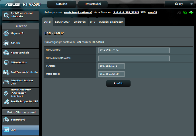LAN - standardní nastavení vnitřní sítě. Lze zde nastavit IP adresu routeru, povolit/zakázat DHCP (automatické přidělování IP adres), rozsah DHCP a třeba i IPTV.