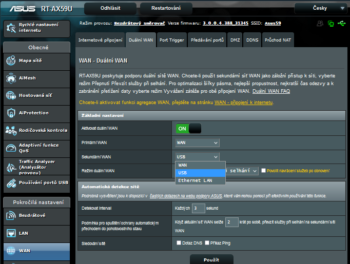 A kromě toho zde najdete i možnost duální WAN. Toto využijete např. v případě, kdy vaše pevné připojení zálohujete třeba mobilním připojením pomocí "klíčenky" (lze nastavit v USB), nebo záložním připojením WAN do některého z LAN portů. režim provozu lze nastavit jako zálohu při výpadku, nebo rovnoměrné využití obou připojení. Navíc si můžete nastavit interval testu připojení, po kolika selhání má dojít k přepnutí a zda test má být příkazem ping, nebo se testuje DNS.