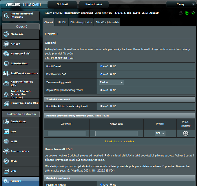 Firewall - kromě standardího nastavení jako je ochrana před DoS útokem můžete zakázat ping z WAN (router bude "neviditelný" pro ping), URL filtr - kde zakážete/povolíte URL adresy, filtr klíčových slov a můžete povolit/zakázat síťové služby. Máte-li podezření na nějaký útok, zapněte si logování. To pomůže k identifikaci útočníka a typu útoku.