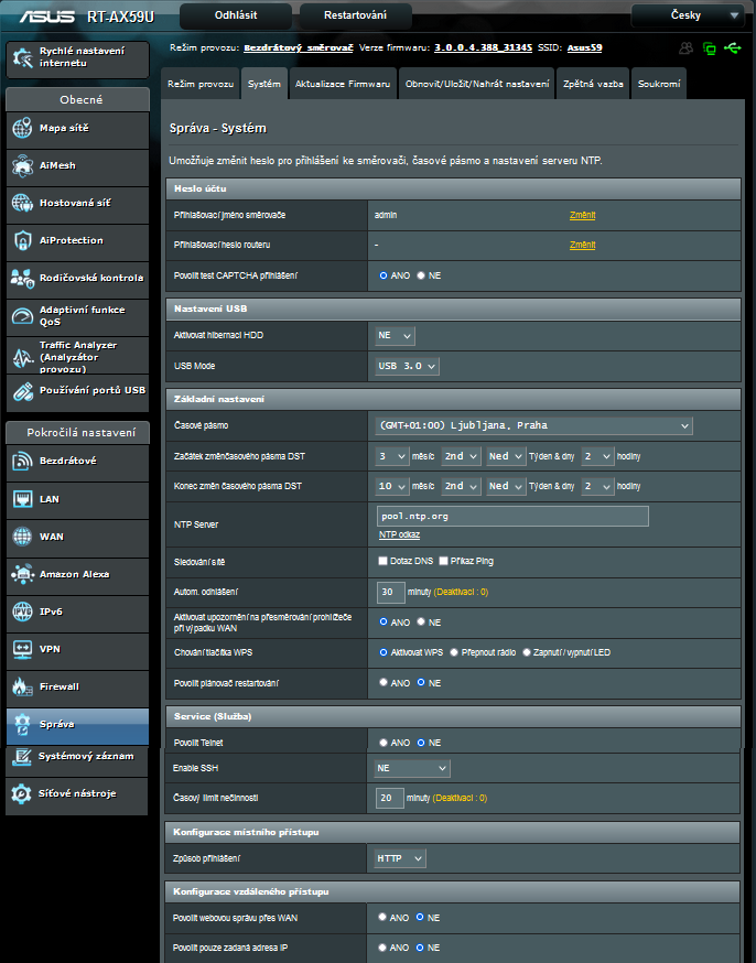 Správa - opět široké možnosti nastavení. Změna přihlašovacího jména a hesla a navíc možnost CAPTCHA kódu, což se hodí, pokud jste si povolili správu přes WAN. Další novinkou (aspoň pro mě) je možnost nastavení hibernace připojeného HDD - to když si k routeru připojíte pevný disk. Je zde i plánovač restartování, nastavení tlačítka WPS, zabezpečený způsob přihlášení - https.