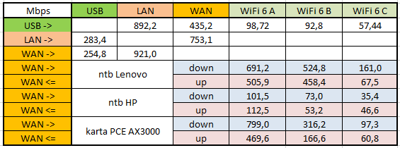 Testování - jako obvykle jsem podrobil router běžným testům. jako zdroj použit PC s SSD diskem jako cíl PC s SSD diskem a 2x notebook s SSD diskem. Notebook lenovo má sice AC kartu (WiFi5), ale s aktualizovaným ovladače dokáže pracovat s AX routery (WiFi6). Druhý notebook HP umí pouze AC (WiFi5). Jako další WiFi klient použit PC s kartou ASUS PCE-AX3000 https://www.tsbohemia.cz/asus-pce-ax300 ... gK2I_D_BwE . Router nastaven jako by to udělal běžný uživatel - tedy režim AX, jeden SSID pro obě pásma, vše automaticky.