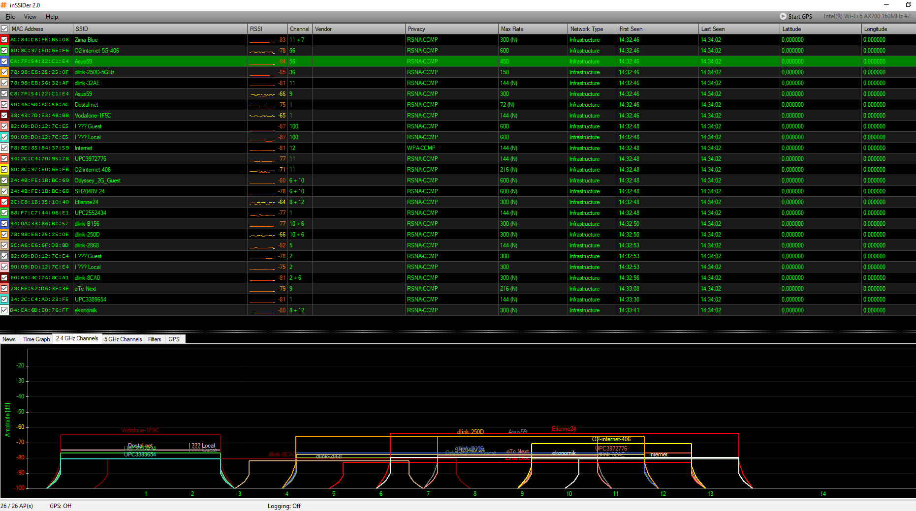 A pro pořádek dodávám screen z programu InSSIDer, jen pro představu, v jakém prostředí musel router pracovat. Někdy se divím, že při takovém zahlcení to routery vůbec ještě dají.