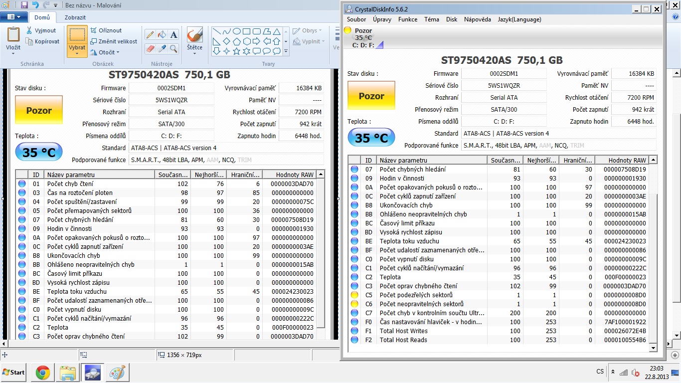 Stav disku lze ověřit programem CrystalDiskInfo. Vlož sem screen do přílohy (aby bylo vše vidět!).