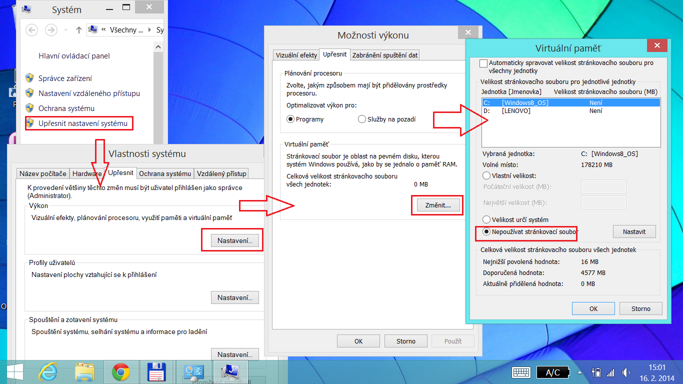 Stránkovací soubor (C:/pagefile.sys) se používá když dochází místo na RAMce. Jak se ten soubor ale stále zvětšuje a změnšuje, tak to pomalu ale jistě zafragmentuje systémový disk. Jak jsem ho vypnul: