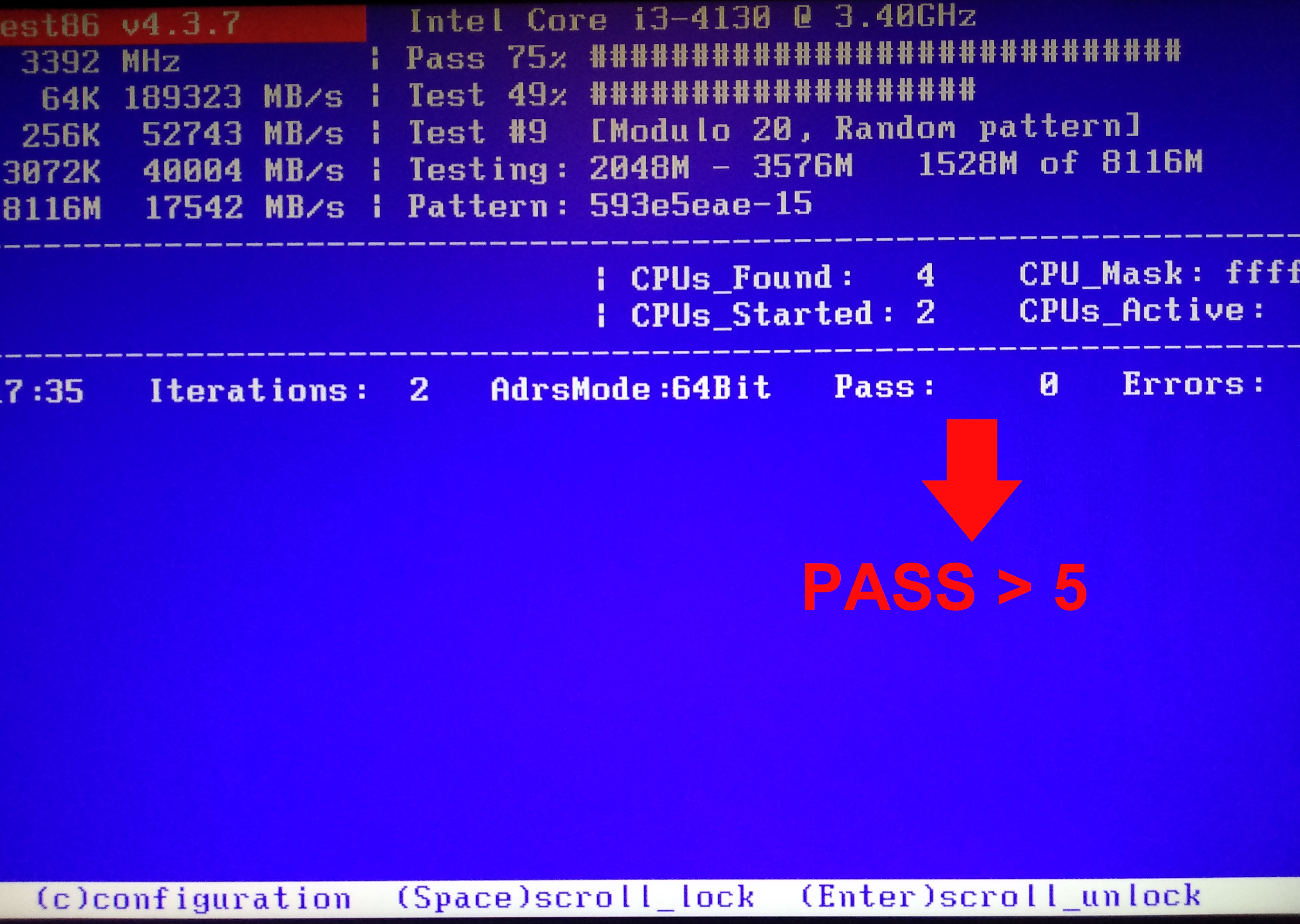 Z vytvořeného bootovatelného CD či flash disku nabootujeme a spustíme test paměti. Memtest86 by měl několikrát otestovat celý rozsah paměti (hodnota parametru PASS > 5). Zde najdete nastavení výpisů paměti