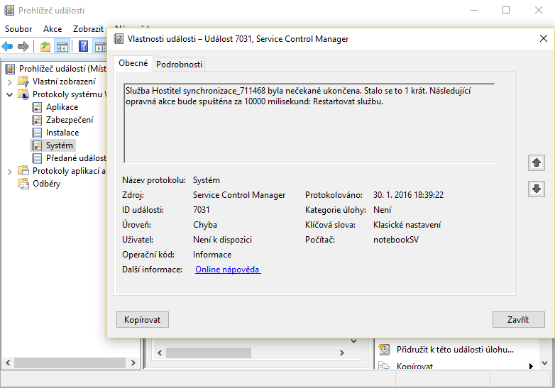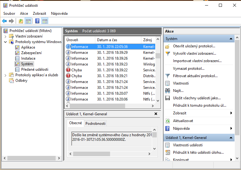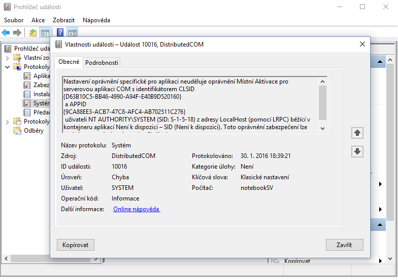 Již delší dobu mě trápí problém s mým notebookem. Jednou za čas se sekne a následně spadne do modré smrti. Koukal jsme se do prohlížeče událostí a přišel jsme, že pády systému doprovází 2 chyby viz obrázky.