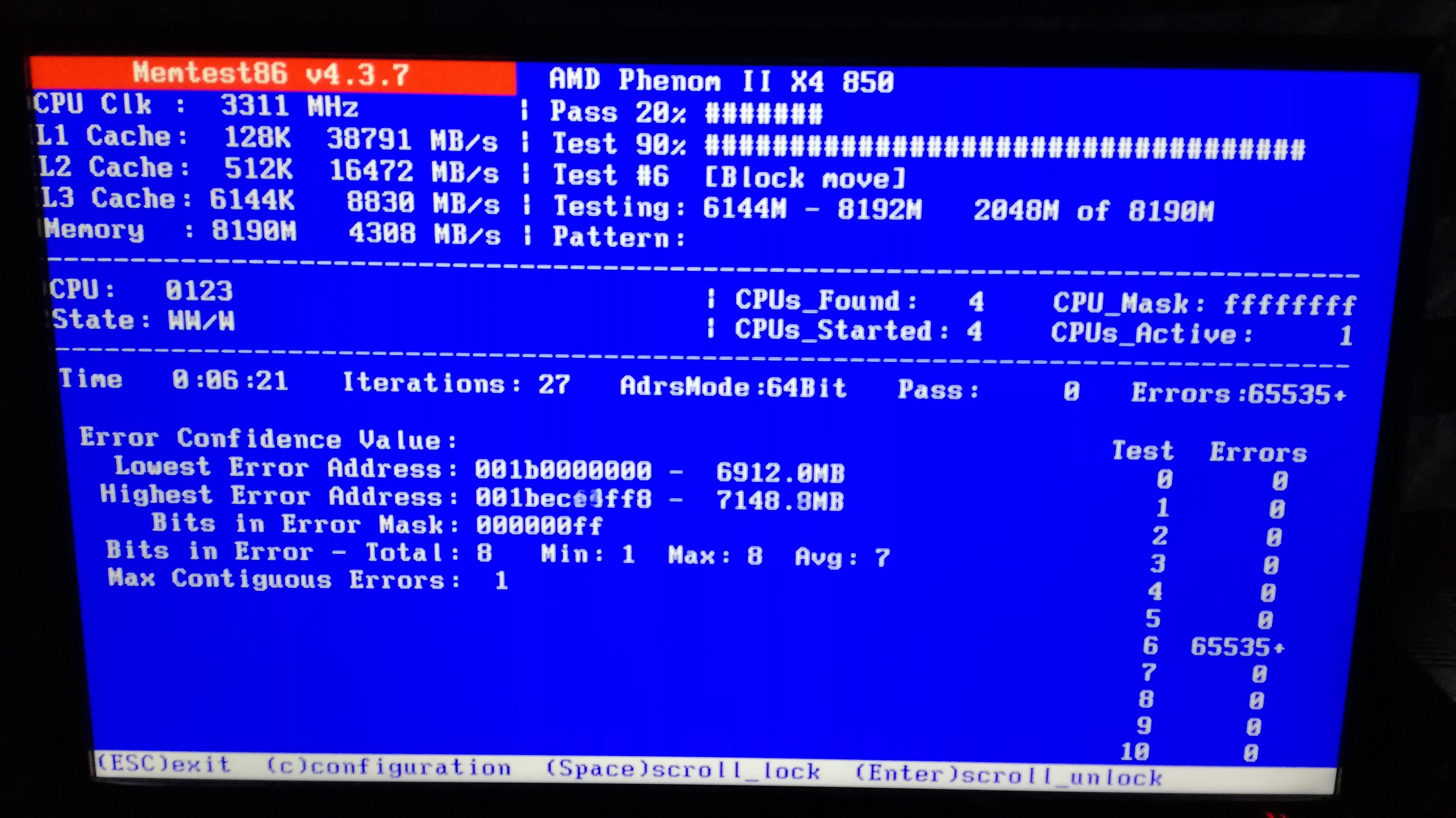 První testování bez A-DATA, objevilo se do cca 6 minut přes 65 000 chyb. Počet chyb se dále neměnil, pouze uběhnutý čas a počet passů.