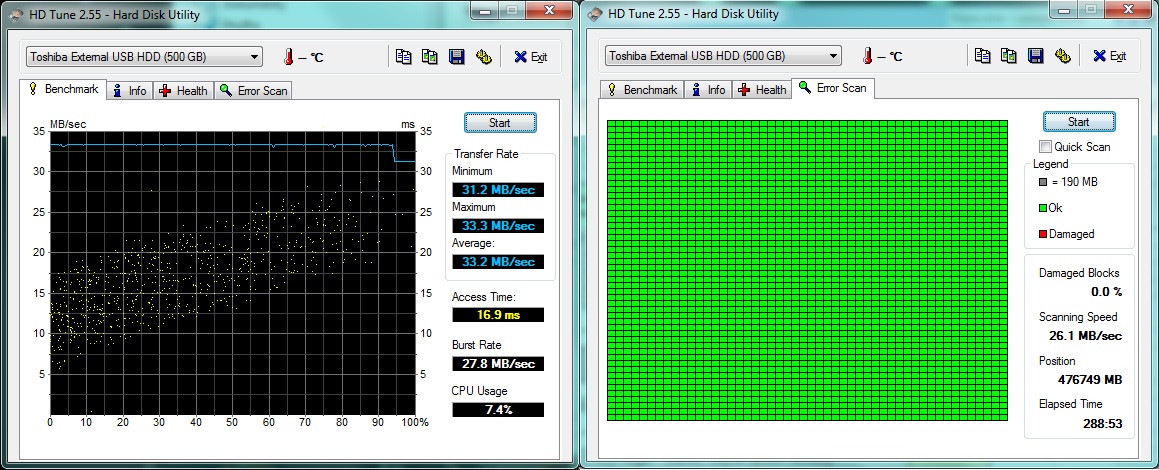 Do přílohy dále přikládám screeny z HD Tune - benchmark a error scan systémového disku a externího disku. Ještě dodám, že ten externí disk se neodpojuje, je tam zapojený pořád. V CrystalDiskInfo ve stavu bylo "pozor", tak nevím jestli by to mohlo s tím mít něco společného.
