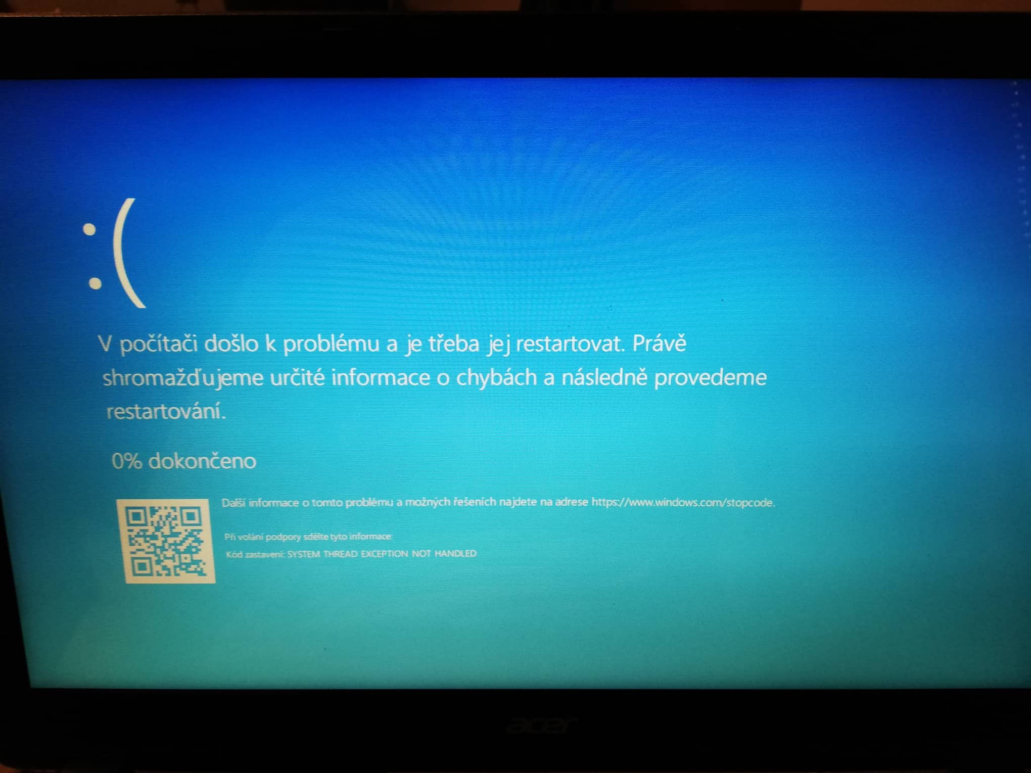 Notebook se zasekl v automatické opravě Windows. V načítací obrazovce pod logem notebooku se píše "Probíhá příprava automatické opravy" ale po chvilce se to restartuje a znovu. Nakonec to hodí modrou obrazovku se smutným smajlíkem "V počítači došlo k problému a je třeba jej restartovat" , "SYSTEM THREAD EXCEPTION NOT HANDLED"