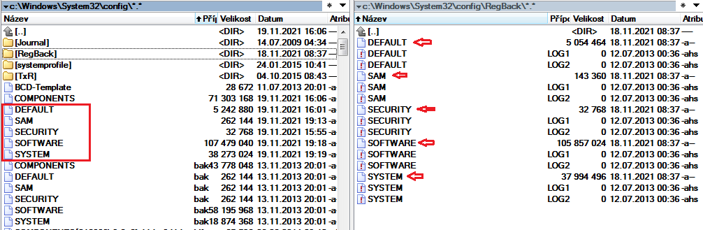 2. Soubory default, sam, security, software, system zkopírovat z adresáře C:\Windows\System32\config\RegBack do adresáře C:\Windows\System32\config.