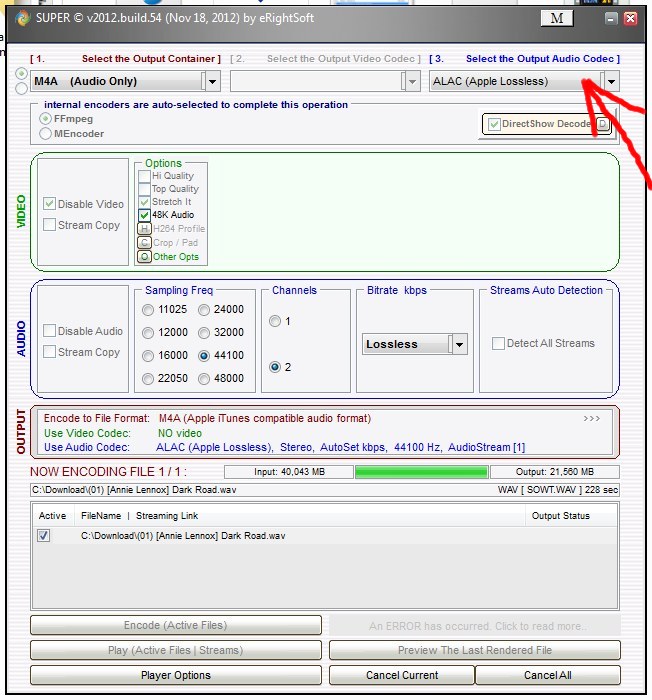 Aha; ale ta druhá volba je ztrátová komprese (AAC LC je ztrátová komprese s bitratem 24–160 kb/s). Já chci bezztrátový kodek ALAC – jako náhradu za bezztrátový kodek FLAC. Jde jen o to, že ALAC není samostatný soubor, nýbrž bývá v kontejneru m4a.