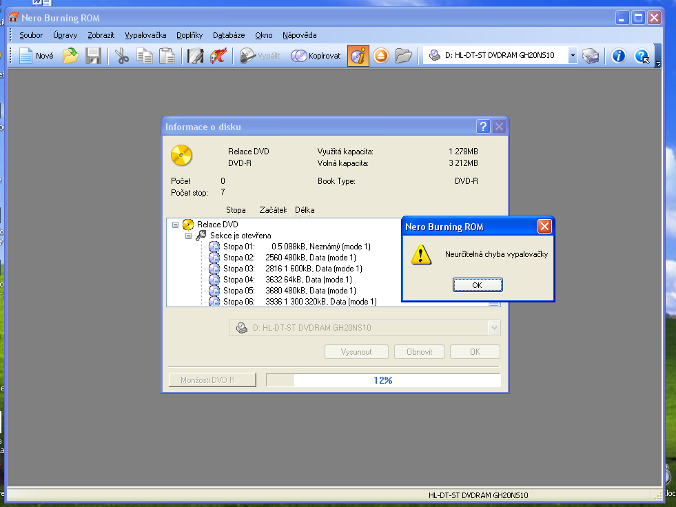 Tak jsem po dlouhém bádání došel k možnosti uzavřít DVD u možnosti informace o disku. Jenže mi to dojelo k 11% napodruhé ke 12% a vyskočila hláška neurčitelná chyba vypalovačky. Neví někdo co by to mohlo a jak to DVD uzavřít, aby mi přehrávalo v DVD přehrávači?