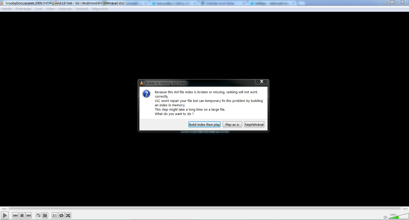 Chýba koniec súboru, kde je uložený index, tabuľka kľúčových snímkov. Ak vo VLC zvolíš "Build index then play", VLC si relatívne rýchlo prebehne celý súbor a vytvorí dočasný index. Počas prehrávania filmu potom môžeš normálne preskakovať v čase sem a tam. Ak chceš len pozerať a nepotrebuješ sa rýchlo presúvať na iné miesto vo filme, tak zvolíš "Play as is".