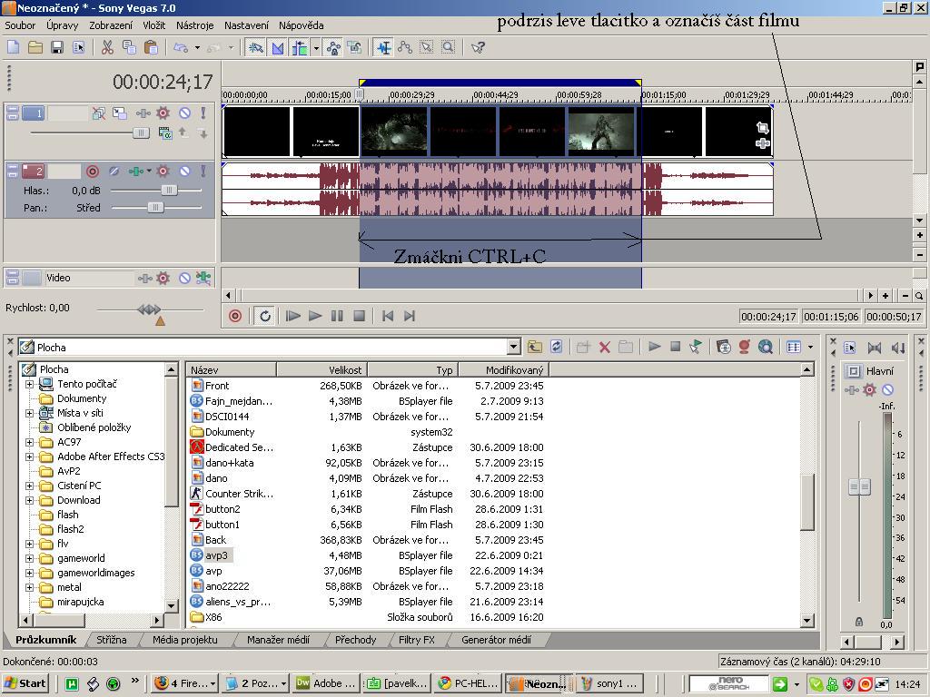 takze označíš si úsek filmu, který chces okopírovat, prostě podržíš levé tlačítko myši a označíš část filmu, kterou chces. Pak zmáčkneš CTRL+C , tímto fylmový úsek okopírujes! Pak otevři novou stránku Sony Vegas 8 a zmáčkneš CTRL+V. Práce na 10sekund . Hodně štěstí