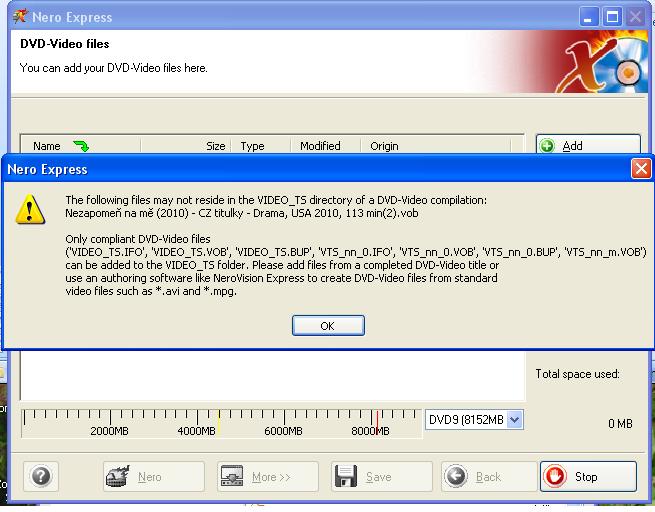 Pokud nepálíš na medium DL tak přehoď v roletce velikost na dvd5.Jakou příponu mají soubory co chceš vypálit a co z toho má být na konci.