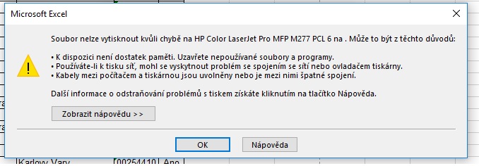 mám problém s výše uvedenou tiskárnou. Netiskne dokumenty z MS office (podaří se vytisknout opravdu jen 1 % náhodou.) Např. u wordu nenapíše žádnou hlášku a dokument zařadí do tiskové fronty jen na 1 vteřinu pak zase zmizí. U excelu napíše viz obrázek níže.