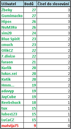 Zpracoval jsem přijaté odpovědi, do slosování postupují všichni níže uvedení "zelení" uživatelé.
