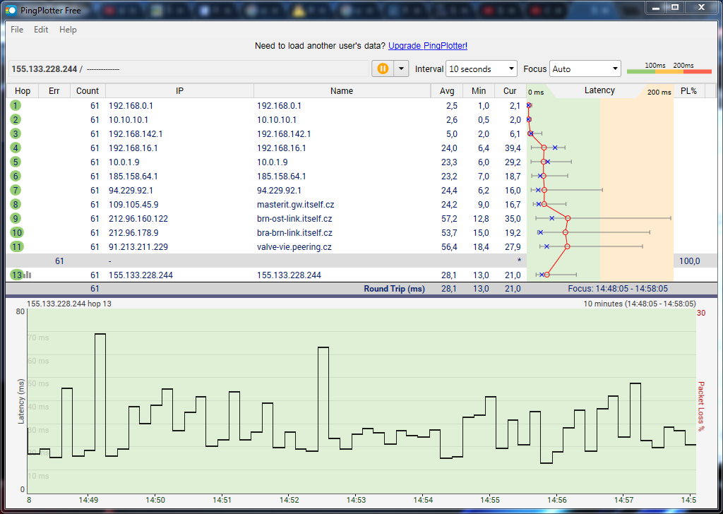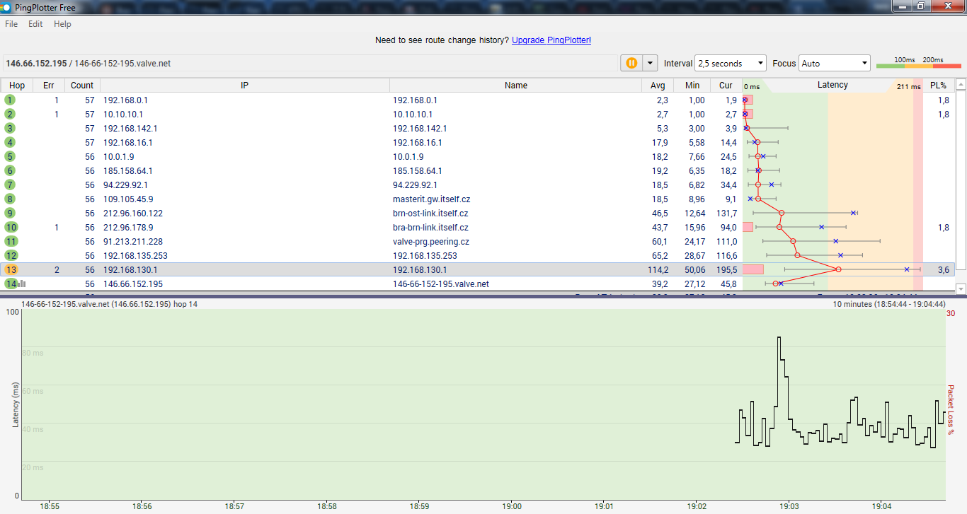 V program PingPlotter používej trasování, protože samotný ping na cílové body neprozradí, kde je problém. Dále testuj při hraní her, jelikož nemá smysl testovat bez zatížení připojení. Hry totiž připojení také zatěžují, některé méně, některé více. A zkus jako cíl nastavit adresu herního serveru.