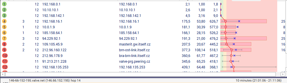 Tak doufám, že jsem udělal správný screenshot, který vám pomůže analyzovat, kde se problém vyskytuje. Trasování bylo směřováno na server, kde probíhala hra, která opět v častých intervalech skákala nad 150 ms.