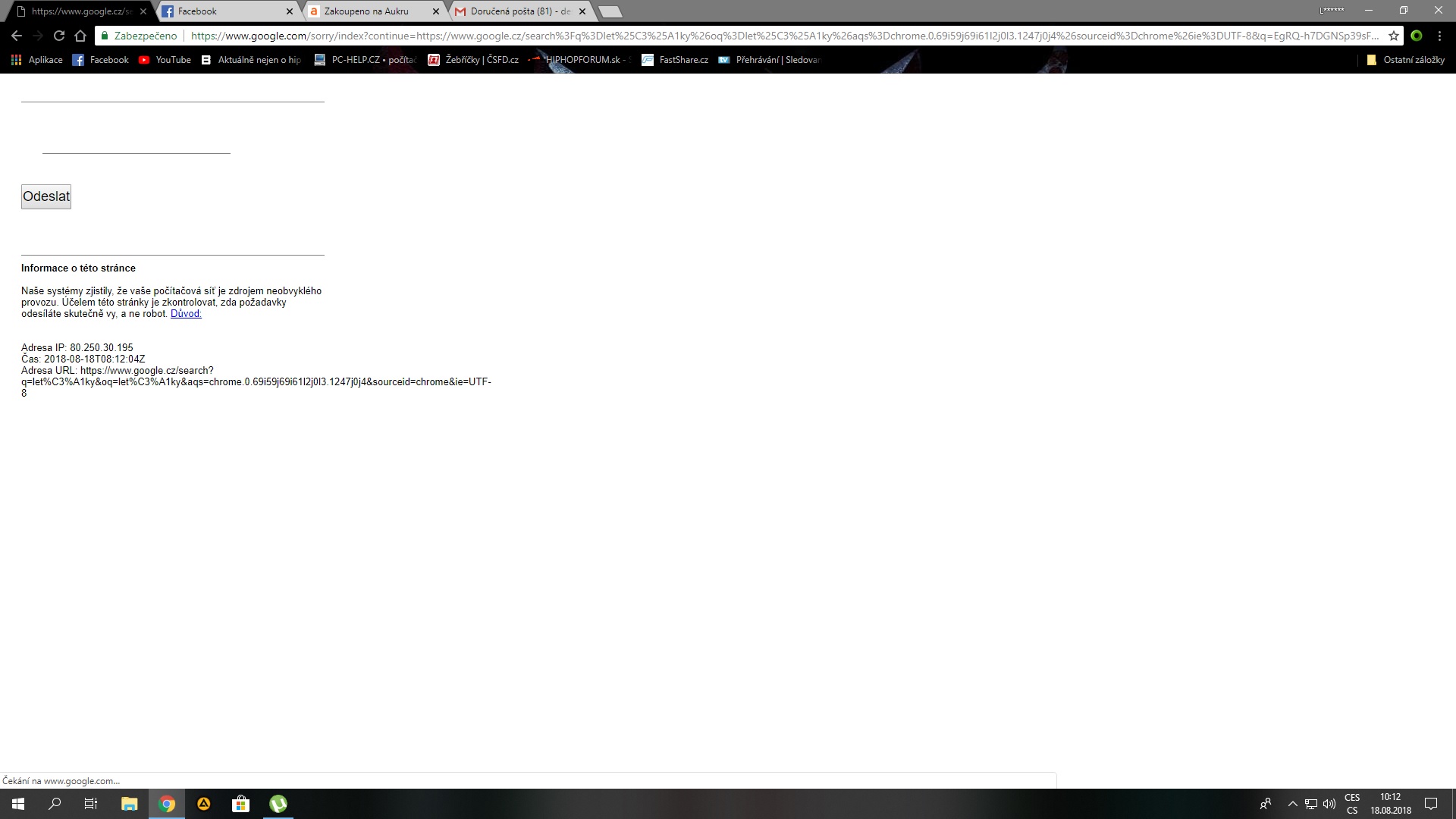 Pochopil jsem z té hlášky, že si to myslí, že jsem robot a měl by tam být catcha kód, pro ověření. Ten tam ale není jsou tam jen čáry, které jdou vidět v příloze.