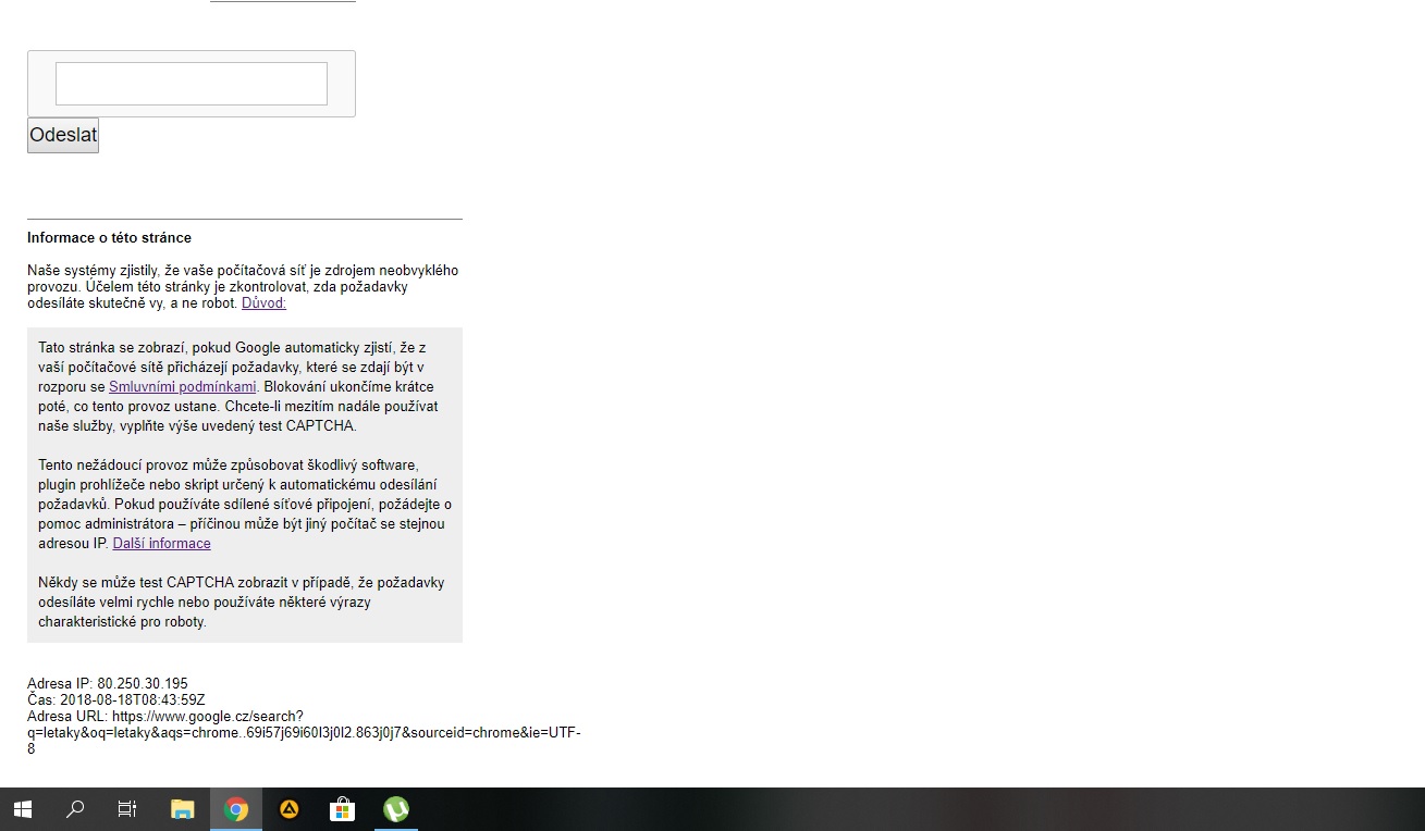 Tohle dělá Google, myslí si, že jsi robot, může to být čímkoliv. Do toho pole bys měl opsat captcha kód, který tam ale z nějakého záhadného důvodu není. Zkus jiný prohlížeč nebo jiný vyhledávač.