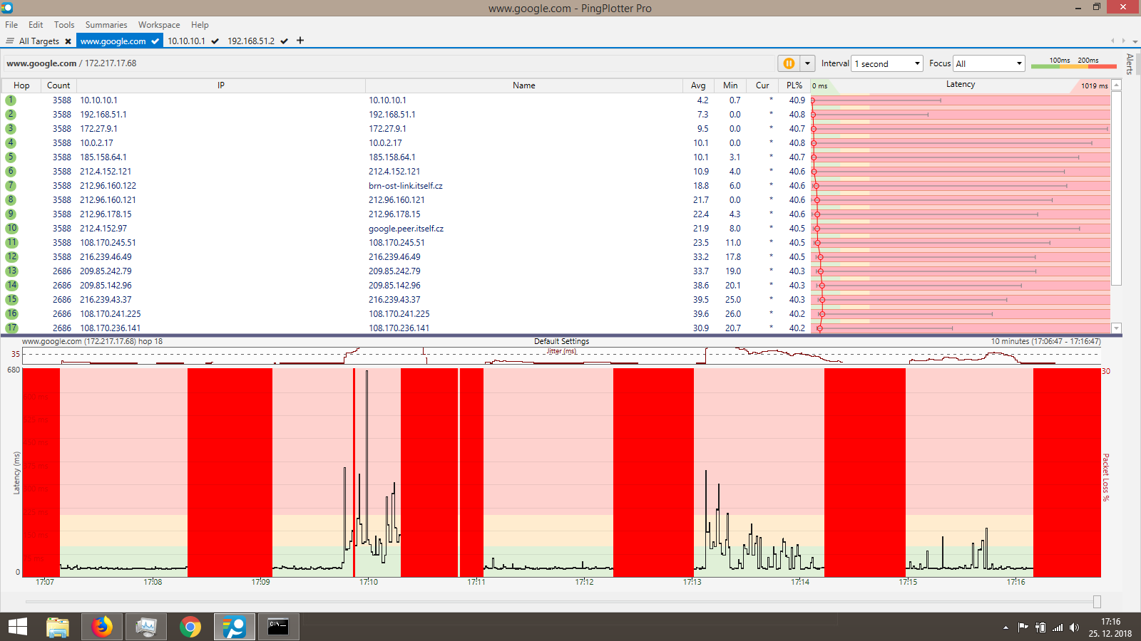 Zdravím, před několika dny jsem se setkal s výpadky internetového spojení (wifi), které probíhájí neustále. Netuším čím by to mohlo být, ostatní zařízení jsou připojena bez problémů. Posílám screen z programu pingplotter, v době nulové odezvy nemůžu pingnout ani vlastní IP.