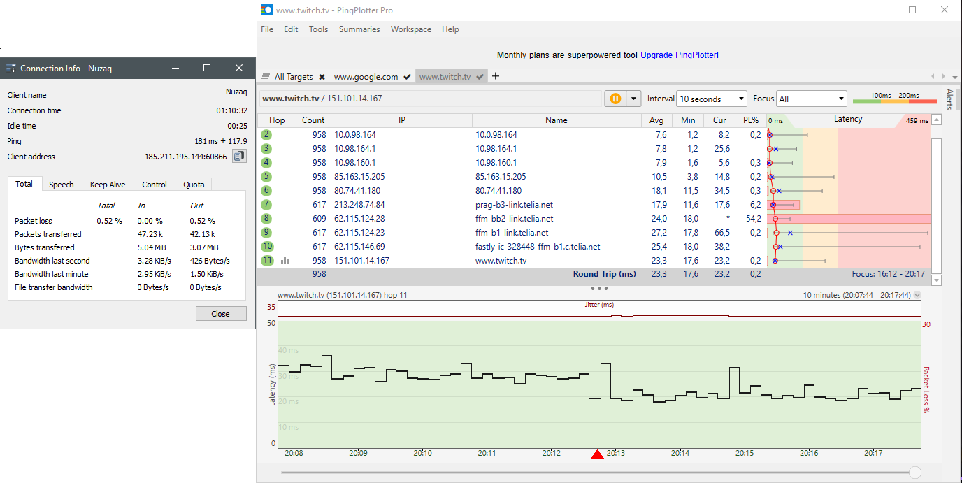 V TS pingáš 185.211.195.144. A v pingplotteru 151.101.14.167 (twitch.tv).