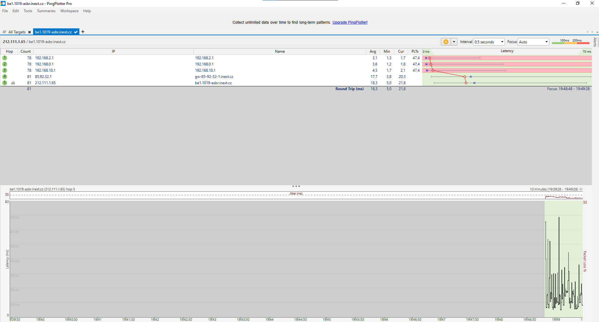 V příloze je narychlo načmárané schéma pro lepší pochopení + Pingplotter z připojení k tomu druhému routeru - viz. výše