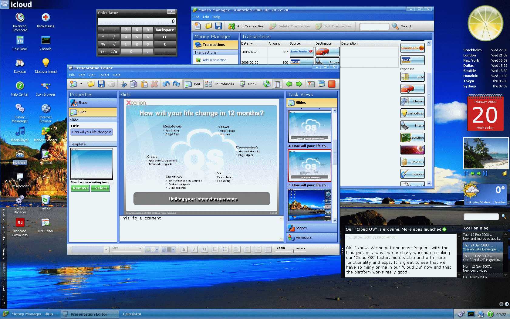 Dnes jsem narazil na jeden článek na Slunečnici, který mi docela zaujal. Jedná se o "operační systém" který se dá používat ve webovém prohlížeči, jmenuje se iCloud. Tak jsem si řekl, že to zkusím a zaregistroval jsem se. Registrace byla docela zdlouhavá, ale asi za 3h mi odeslali přístupové údaje. První spuštění trvalo poměrně dlouho. Ale pak se mi to začalo líbit. Trochu se to seká a je to pomalejší, ale stojí to za zmínku. Do systému se dostanete jedině přes prohlížeč Internet Explorer a je docela dobré se klávesou F11 přepnout do celoobrazkového módu.
