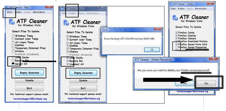 Pouzivej obe dve moznosti; 1. hlavni Main, 2. browser. Prohlizec se lisi podle toho, jaky je nastaven jako defaultni, Mozilla Firefox, nebo jiny (Opera), ale MFF je pro cisteni ATF programem prioritni.