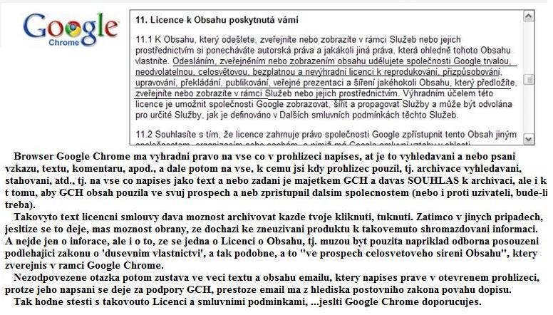 Pro decka asi ponekud slozite rozlisit vyznam a takoveto riziko ...ale jednou se budete pripadne divit, az zjistite, ze kazde vase slovo, vcetne prihlasovacich hesel jsou majetkem GCH, protoze i prihlasovaci heslo je napsana prostrednictvim otevreneho GCH prohlizece, stejne tak i email > timto ujednanim v licenci davas svoleni, ze GCH je toho vlastnikem.