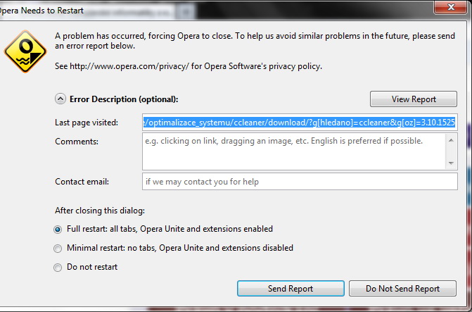 Nevíte někdo co je pravou přičinou věčných pádu Opery? viz.foto screen.Pada mi všude i ted nově nainstalovana na zcela nově nainstalovaném legalnim WIn 7 Pro.Je to muj nejoblíbenější prohližec ,ale tohle už je fakt kriticke...