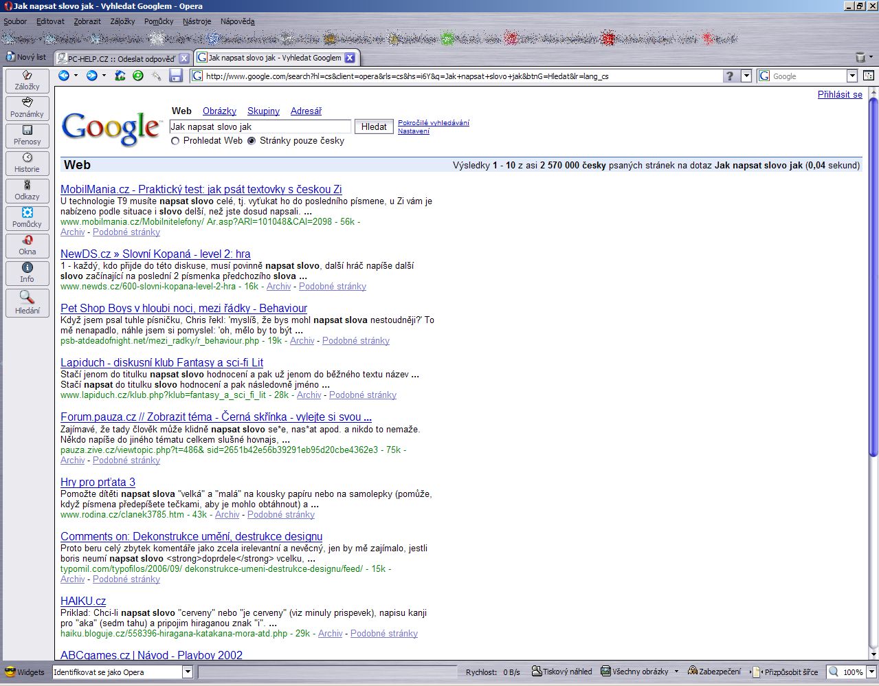 liborku, tvoje zobrazování v Googlu je vážně moc divné, včetně výsledků. Použil jsem tvůj výraz do Googlu a počet nalezených výsledků je neporovnatelně větší, než je na tvém obrázku. Bohužel ti neporadím, jestli to je nebo není kvůli FF, protože používám Operu.