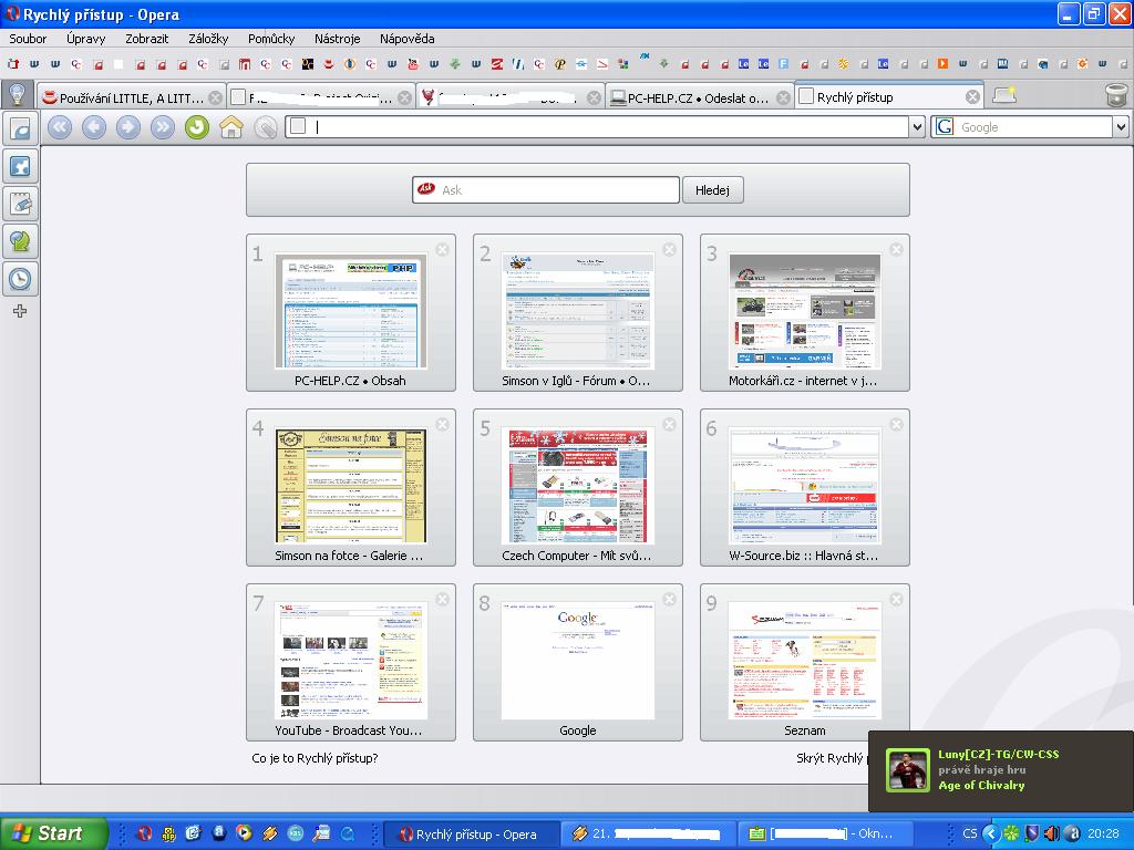 Opera, zamiloval jsem se do možnosti rychlý přístup, takže nemusím mít "domovskou stránku", ale hned několik tzv. domovských stránek vypadá to asi jako na příloze