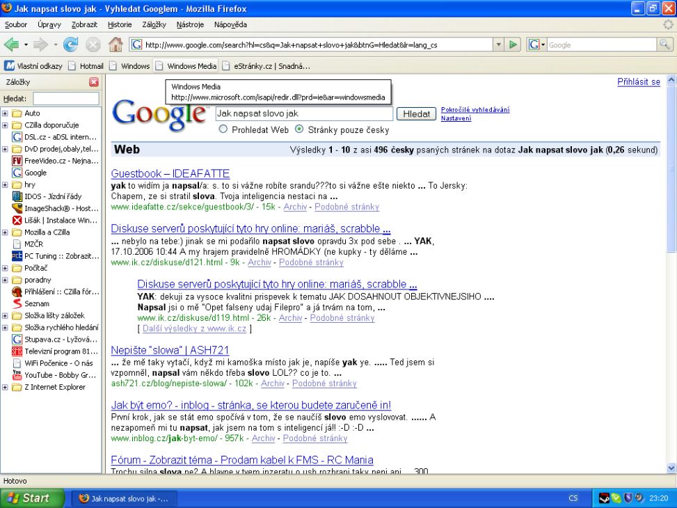 .tím pádem toho moc není,respektivě nic relevantního.Se slovem jakmi nenaskočí nic!!!Pokud napíšu do vyhledávače jen slovo jaktak potom se to objví správně.Jakmile něco připojím už jsem nahranej a nic nenajdu.Prosím v čem je chyba.V Exploreru se to neděje,hledal jsem nějaký nastavení jazyků,nebo tak něco ale nic.Ovšem dřív jsem taky nic neupravoval a hledalo to normálně.- Baron Prášil